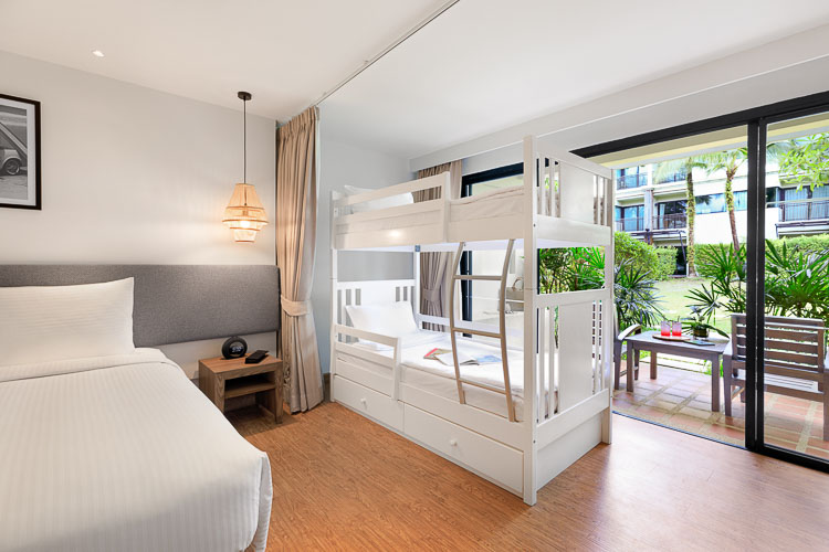 - Für Familien mit zwei Kindern empfehlen sich die 40 qm großen, ebenerdigen Family Garden Terrace Zimmer mit Doppelstockbett