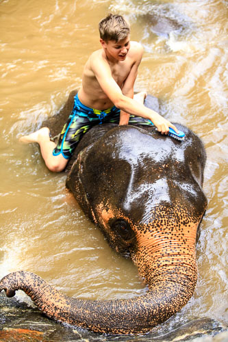 Nun heißt es wieder aufsitzen und es geht weiter durch den Dschungel in Richtung Fluss und Badestelle. Am Fluss angekommen heißt es für uns erst einmal Badekleidung anziehen, während die Elefanten von den Mahuds bereits in den Fluss geführt werden. Unsere Aufgabe ist es jetzt die Elefanten ausgiebig mit einer Wasserschale und einer Bürste zu schrubben. Zu Beginn geht es ab in den tieferen Teil des Flusses, sodass das Tier fast bis zum Rücken im Wasser steht. Dies erleichtert einem die Reinigung von Kopf und Rücken. Anschließend geht es in einen flacheren Teil, wo ich mich an den Bauch, die Beine und die Stoßzähne mache. Eine wirklich anstrengende und schweißtreibende Arbeit, die aber sehr viel Spaß macht. Zur Abkühlung gibt es vom grauen Riesen gerne eine ordentliche Rüssel-Dusche.