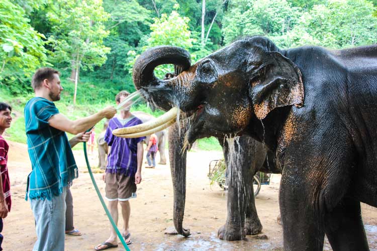 Nachdem die Elefanten nun ein bisschen Vertrauen zu uns aufbauen konnten, geht es daran die Elefanten vom groben Dreck zu befreien. Die Tiere beschmutzen sich gerne mit Erde, um ihre Haut zu schützen. Mit palmenwedelartigen Zuckerrohrblättern kann man die gröbsten Sandverkrustungen von der Haut „schlagen“. Anschließend geht es unter die Dusche. Mit einem Gartenschlauch wird der Dickhäuter rund herum ordentlich abgespritzt. Gerne darf man den Schlauch auch etwas länger direkt auf das Maul richten. Ein Elefant trinkt pro Tag gerne zwischen 150 und 180 Liter und nimmt die Erfrischung gerne an.